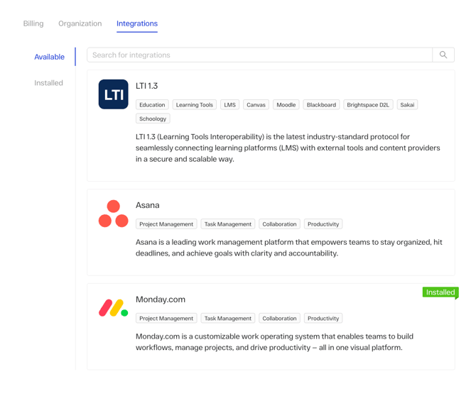 Some integrations—like Asana, monday.com, and LTI (for universities)—can only be set up by an Organization Admin. If you're not an Organization Admin and need access to a specific integration, please reach out to your Admin directly to request approval to access.