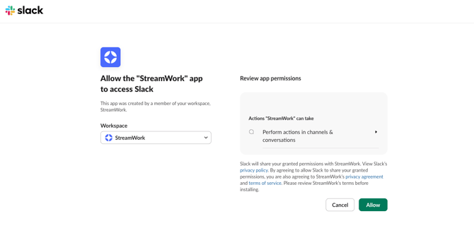 6. Next, follow the Slack prompts to add the StreamWork + Slack app to your Slack workspace. You'll likely be required to sign-in to your Slack account in order to connect the apps.