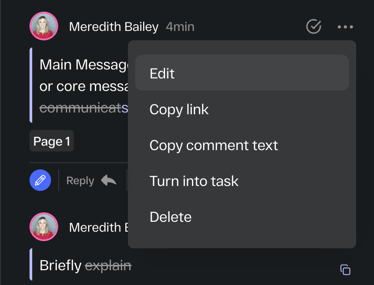 - You can edit the comment text at any time by clicking the 3 dot menu in the top right of the comment. Select "edit".